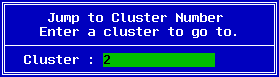 You may use the arrow keys to move around the FAT to edit or change values. The FAT can be very large. On a 2Gb disk there are 65,506 clusters. This can make scrolling though them very difficult. To ease this situation, you can press the J key and you will be prompted with this dialog box: