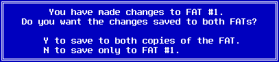 Once you have chosen to write your changes back to disk you will be prompted with another dialog box. Generally there are two copies of the FAT for data redundancy purposes. It is important to keep them both the same. Thus at this point you are prompted to make changes to both or just one of them.