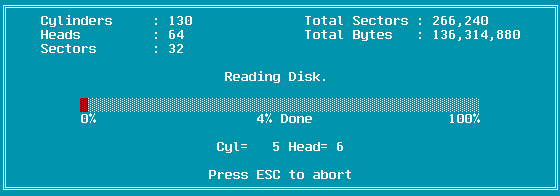 The Read Disk Test reads the selected disk at a sector level. One complete track is read at a time, head by head, starting at cylinder zero up to the maximum number of cylinders on the disk. As the test progresses, a bar graph indicating progress is displayed.