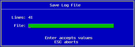 Either enter a file name to save the information into a file or press ESC to abort the save. If a file name was entered and Enter was pressed the following processing dialog box will be displayed as the log file is being saved: