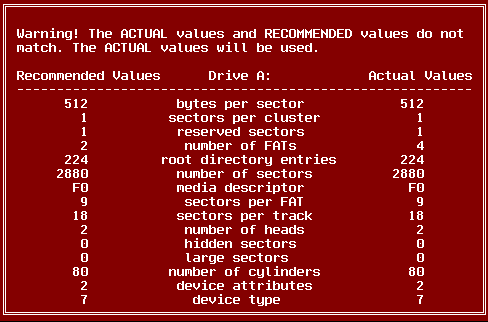 You should not continue beyond this point. You should take actions to correct the problem. It probably means that you should back your data up and reformat the disk. In the above example, the number of FATs is incorrect. The disk reports that it has 4 FATs, but OS/2 recommends that it should only have two.