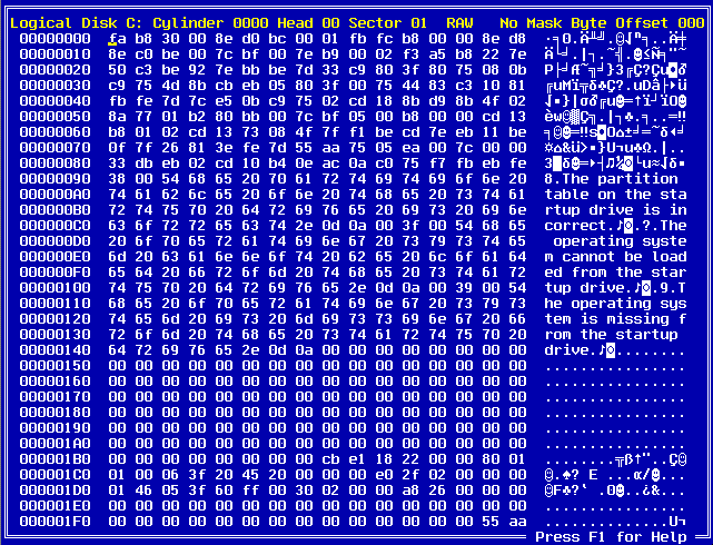 If you pressed the Enter key, DiskEdit will read the sector and display it to you. It may look similar to this: