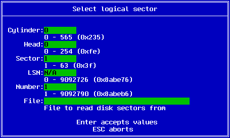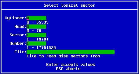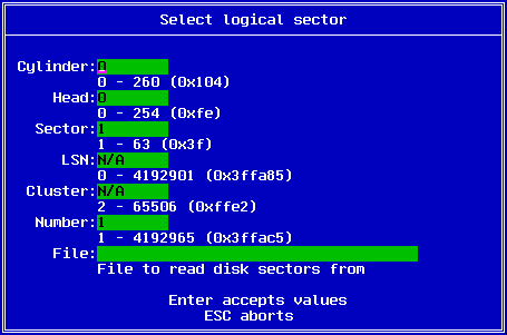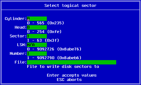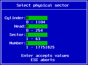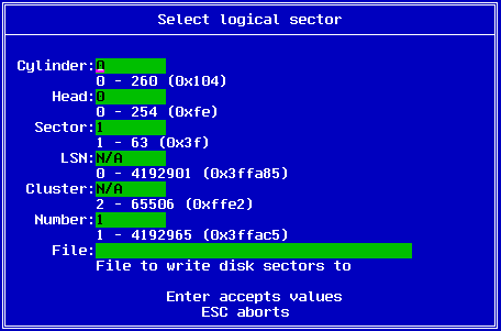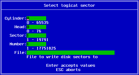 You enter the starting cylinder, head and sector, the number of sectors as well as the file name which the data will be saved to. Once the data has been saved as a file, you may edit it by other means. The F8 key may be used to save the file back to the disk.