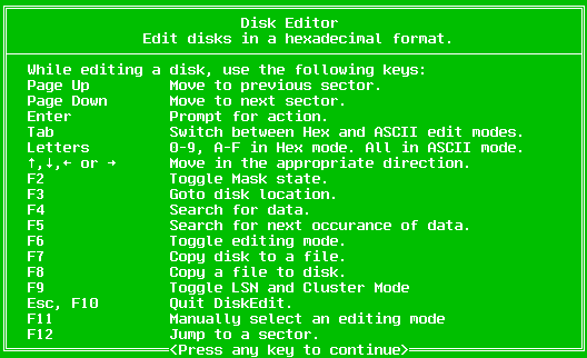 The F10 and Escape keys exit the DiskEdit program. You will be prompted to save any unsaved data if needed.