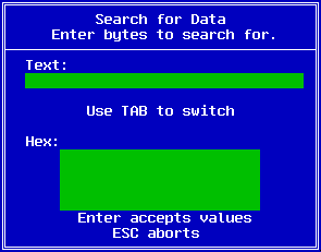 The F4 key is used to search for data. You may enter data in ASCII text form, or in hexadecimal. The Tab key switches between entering data in ASCII and hexadecimal.