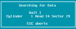 The cylinder, head and sectors are displayed as they are read. You may press the Escape key at any point to abort the search.