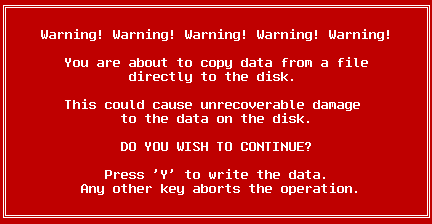 If you are certain that you wish to continue, press the Y key. Any other key aborts the operation, and the data will not be written to disk.