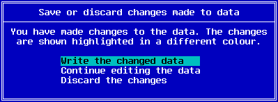 When you have finished editing the data, and you wish to write the data to disk, simply press the Enter key. You will be presented with the following dialog box: