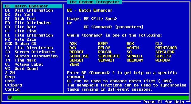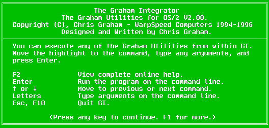 GI lists all of the available programs, their uses, and a summary of all of the switches and parameters. It also provides full line editing features so that you may edit the command line which is passed to the programs. Pressing enter will enable the execution of the specified program.