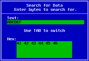 The F4 key is used to search for a particular sequence of bytes. You may enter data in ASCII text form or in hexadecimal. The Tab key switches between entering data in ASCII and hexadecimal.