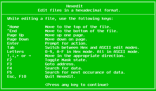 HexEdit allows you to edit a file in hexadecimal or in normal ASCII. The data is displayed in both hexadecimal and ASCII. The TAB key switches between hex and ASCII editing modes. When you are editing in hexadecimal, you may only enter hex values ('0'-'9','A'-'F'). In the ASCII editing mode it is possible to use all ASCII keys. The cursor control keys are active in both modes. The Control-Home keys take you to the beginning of the file and the Control-End keys take you to the end. The Page-Up and Page-Down keys move you one page up or down respectively.