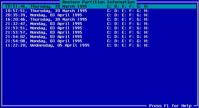 Each partition is dependent on the previous one. Using the above example, if drive D: was damaged, then D: through to H: would be affected. This means that each partition should be restored, starting at the lowest one. In this instance, drive D: should be restored first. If only D: was damaged, then E: to H: may reappear once D: was correctly restored as E: to H: were not damaged themselves, only the links to them were damaged.