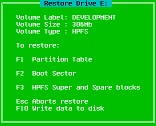 Using the F1 or F2 keys for FAT partitions or the F1, F2 and F3 keys for HPFS partitions, select the elements which you wish to restore. All available elements are recommended for restoration, however there may be circumstances when you may not wish to restore everything. As each element is selected, an asterisk (*) will appear next to the function key.